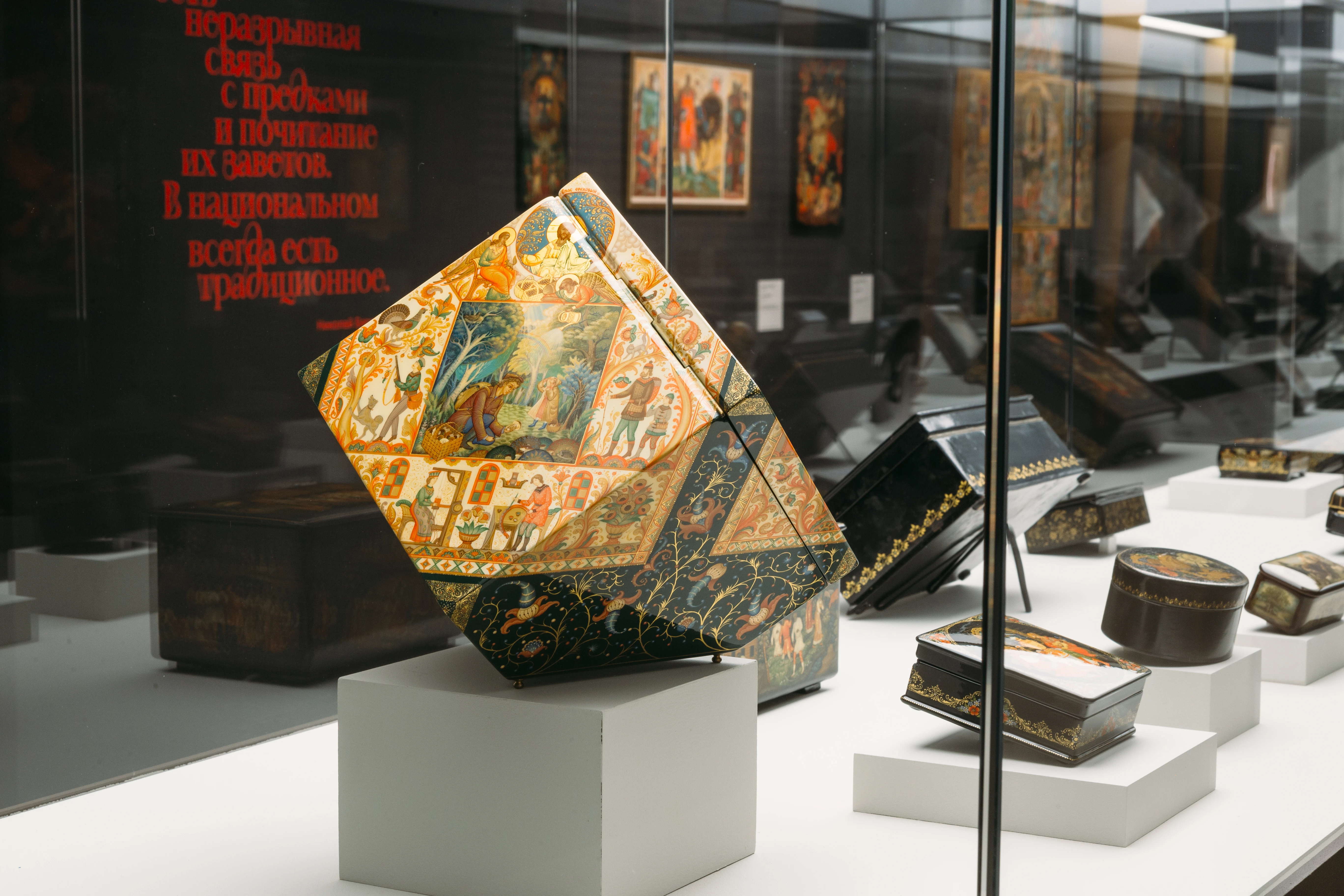 Выставка проводится в год 230-летия Федоскинского промысла, который занимает особое место в истории русского декоративно-прикладного искусства и стал важной частью экспозиции. Произведения мастеров традиционных центров лаковой миниатюры — Федоскино, Палеха, Мстёры и Холуя — мост между прошлым и настоящим, историей и культурой.