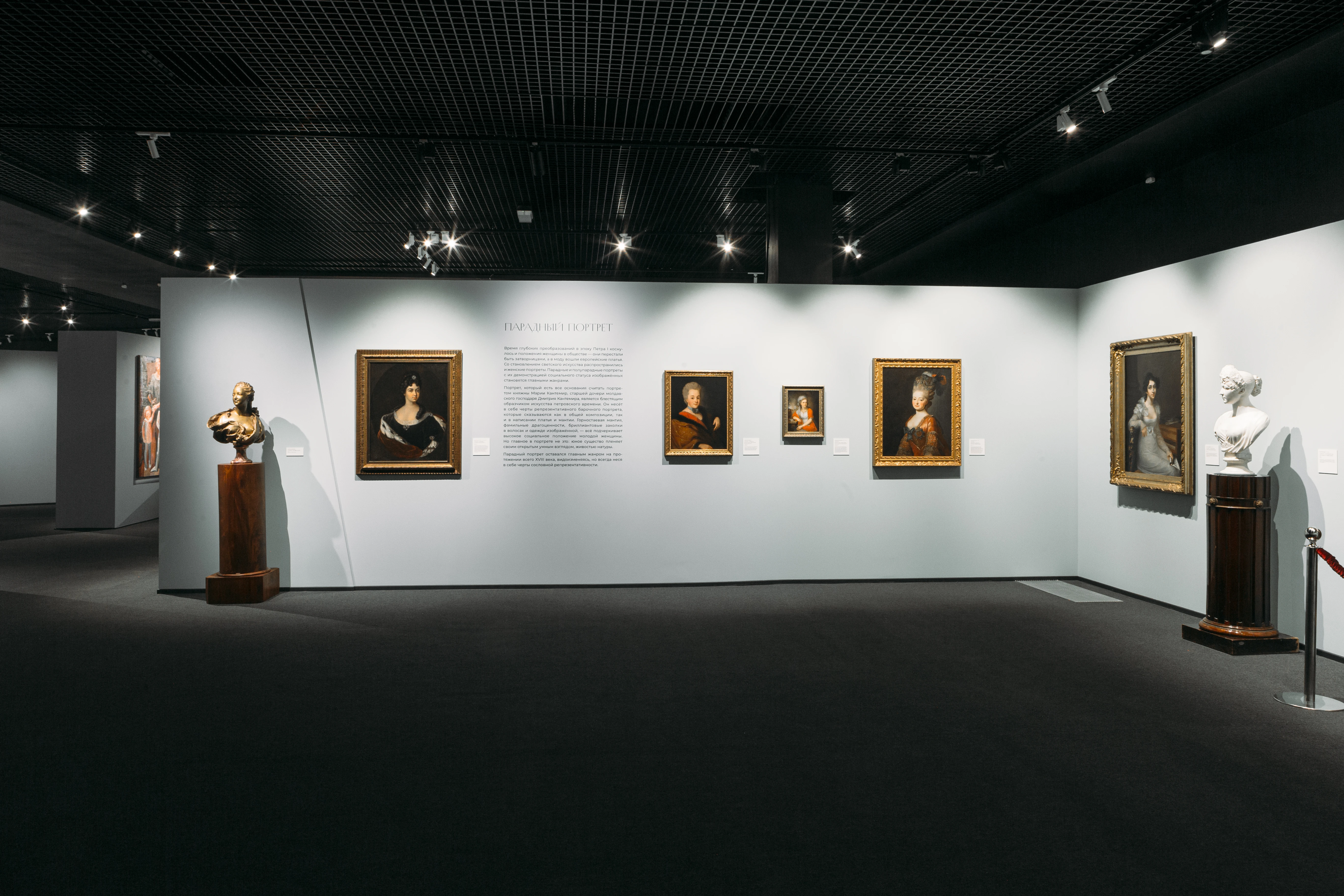 В отдельный раздел выделен парадный портрет XVIII–XIX века, в котором подчеркивается сословная принадлежность модели. Яркие примеры подобных работ — портрет княжны Марии Кантемир, написанный в 1710 году, во времена Петра Великого Иваном Никитиным (?) или портрет княгини Марии Федоровны Барятинской с дочерью Ольгой (1817) кисти Робера Лефевра. В обоих портретах внешняя атрибутика, наряд, убранство модели подчеркивают статус женщины. Получивший блестящее развитие в эпоху классицизма, парадный портрет возрождается в стилистике модерна, о чем свидетельствует одна из лучших работ Леонида Пастернака, изображающая жену известного чаеторговца Анну Борисовну Высоцкую-Готц.