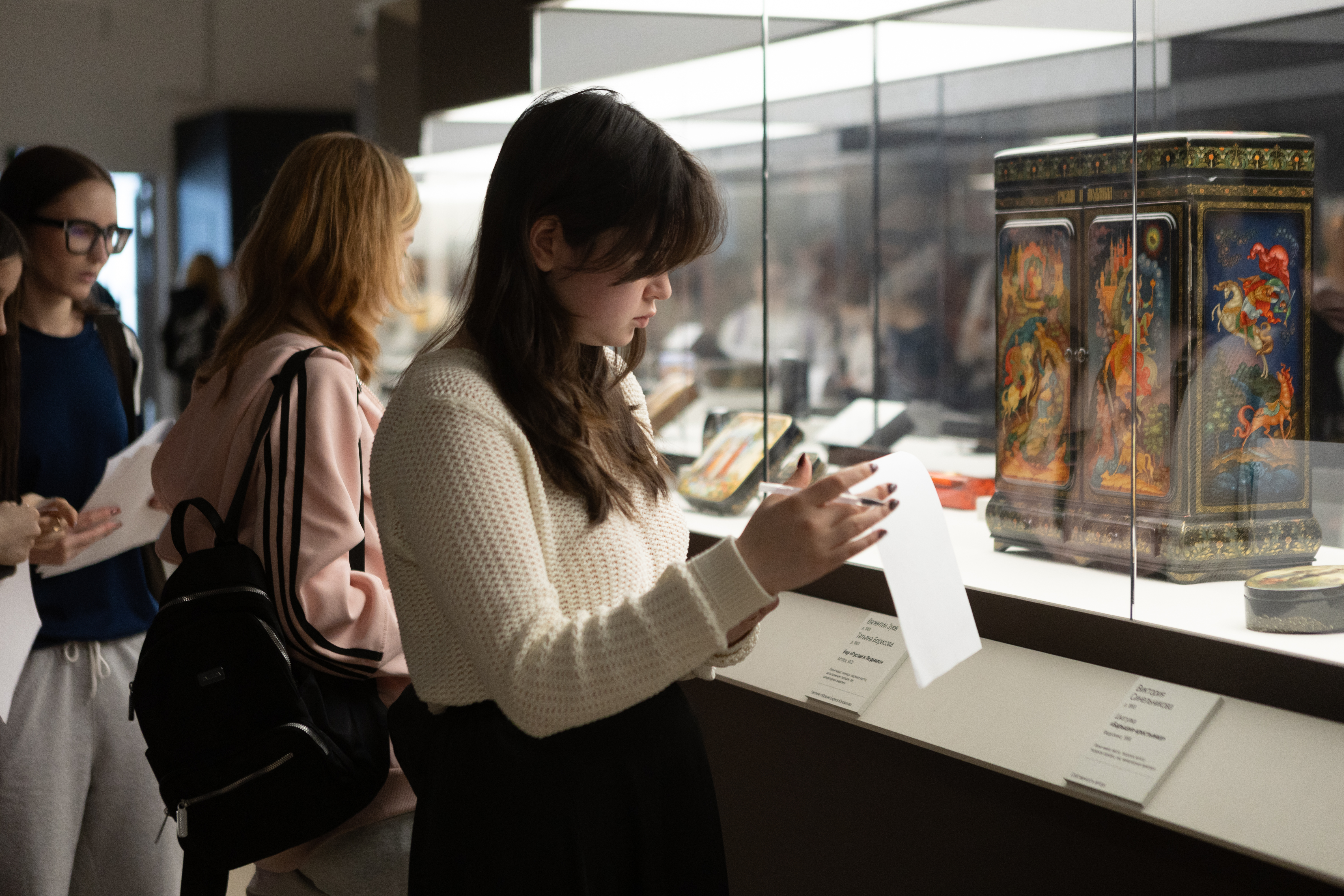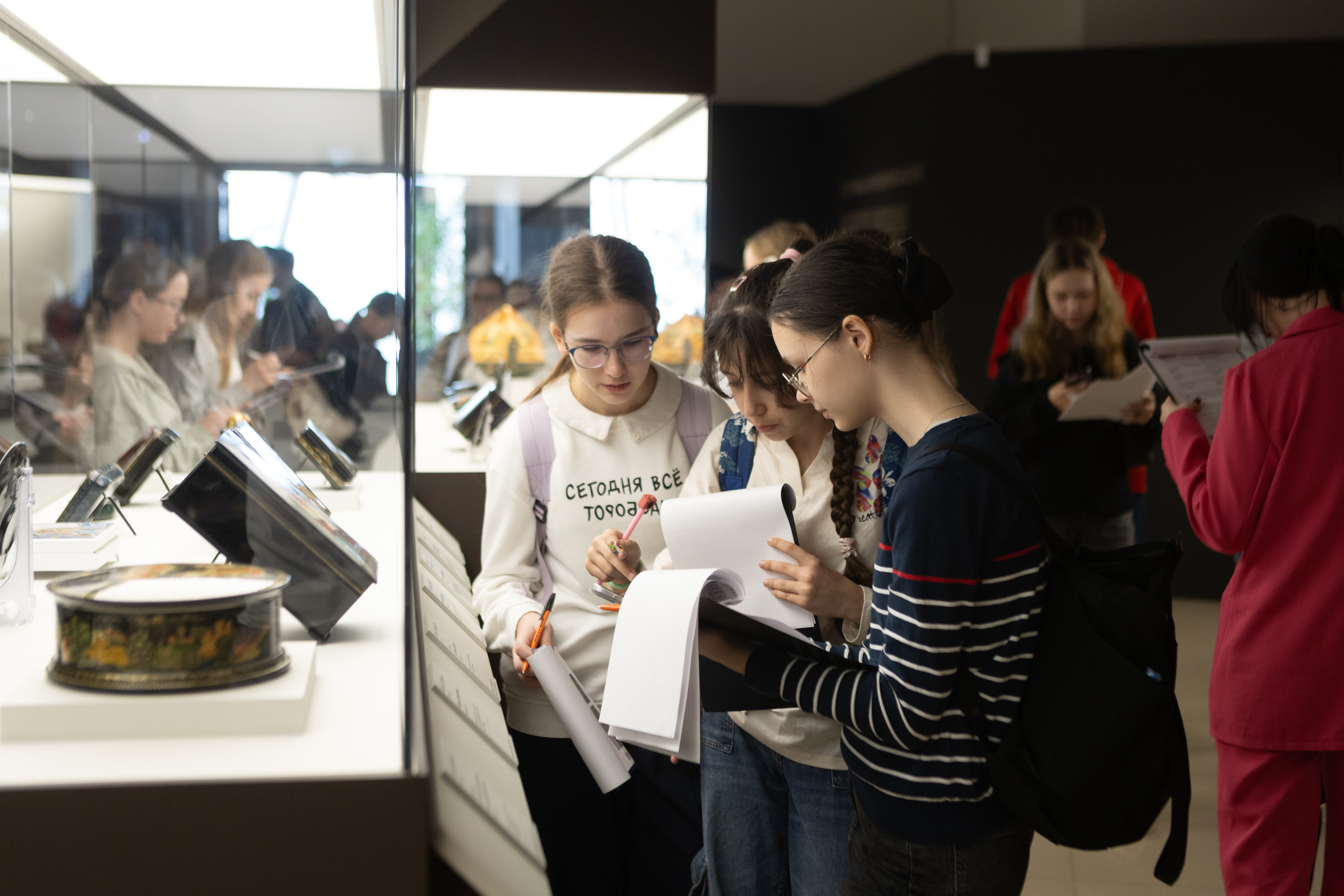С 7 по 19 апреля 3 929 школьников участвовали в интеллектуальных соревнованиях и искали ответы на вопросы заданий в пространстве выставки и представленных там произведений мастеров традиционных центров лаковой миниатюры — Федоскино, Палеха, Мстёры и Холуя.