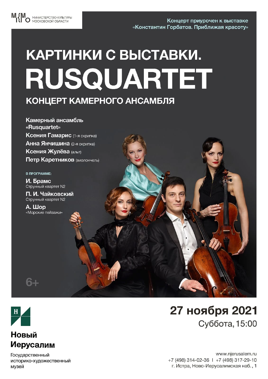 Государственный историко-художественный музей «Новый Иерусалим» 27 ноября в 15.00 представил концерт в Конференц-зале музея в рамках цикла «Картинки с выставки». На сцене выступил камерный ансамбль «Rusquartet». Концерт был приурочен к выставке «Константин Горбатов. Приближая красоту».
